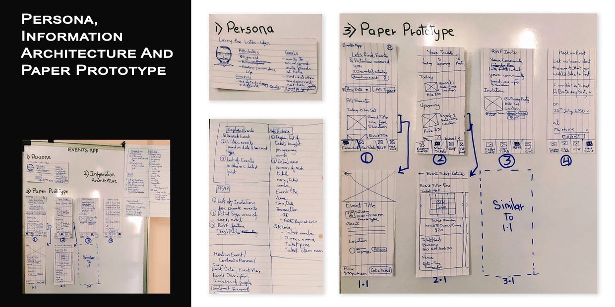 Sketches with pen on notebook pages were made to create primitive user interface components to give a form to the information architecture. Best ones selected to create a prototype model depicting the flow of screens.